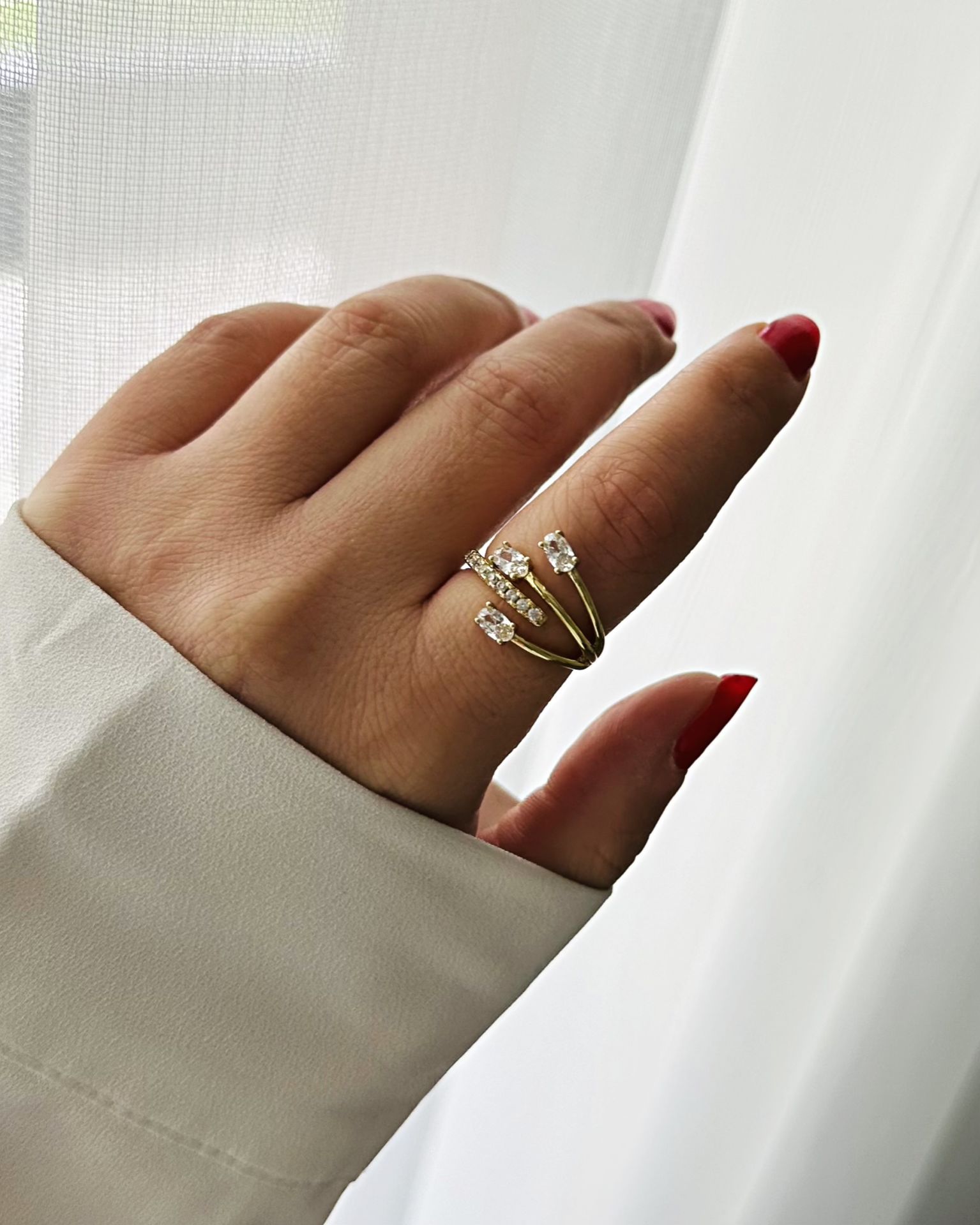 Vıp özel üretim birinci sınıf altın kaplama ithal üründür. Suya dayanıklı ve antialerjiktir. Günlük kullanıma uygundur. Açık gold(14 ayar altın rengi) renktedir. Kuyumculuk işçiliği ile üretilmiştir. Üzerindeki taşlar zirkonyum taştır. Zirkon taş, altınların üzerinde de kullanılan taştır. Parlaklığını yitirmez, matlaşmaz. Taşlar tırnaklı tutturma yöntemi ile montüre sabitlenmiştir. Ağır ve sert darbeler almadığı sürece düşmez, dökülme. Uzun ömürlü kullanım imkanı sunar. Üstten sıkıştırıp açarak dilediğiniz parmağınızda kullanabilirsiniz. Ölçü gerektirmez.